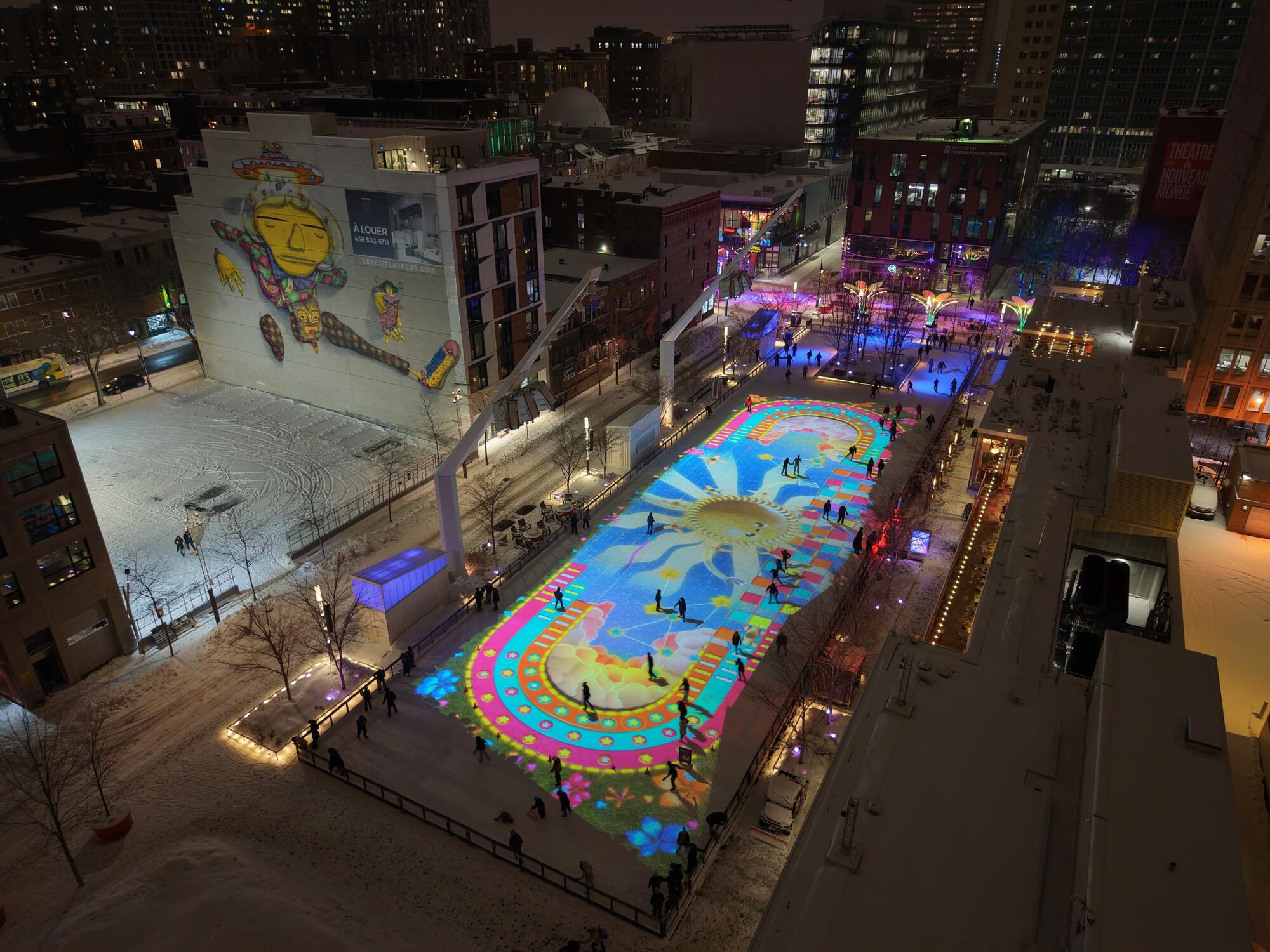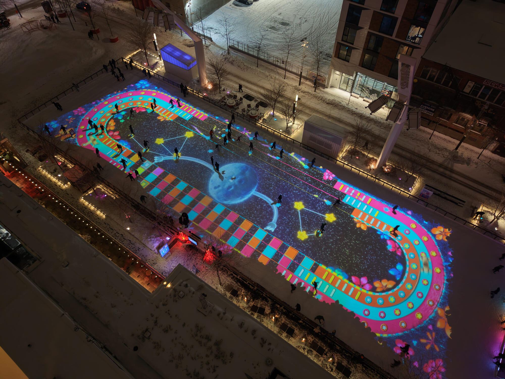Co-créée avec Doki, la patinoire interactive de l’Esplanade Tranquille, au cœur du Quartier des Spectacles de Montréal, transforme la glace en un véritable portail vers des univers ludiques. Inspiré par l’imaginaire collectif et les jeux de notre enfance, un dispositif de projection et de détection de mouvements en temps réel permet à la surface glacée de réagir aux déplacements des patineurs. Des contenus visuels et sonores émergent et évoluent en permanence sous leurs patins, faisant de chaque session une expérience unique.